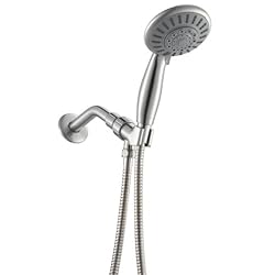 Ana Bath Handheld Shower System gives you the easiest way to upgrade your shower system without any tool.No power drill, no screwdrivers, just your hands.With the 4 inch 5 function handheld shower, you can feel a whole new fantastic shower experience with our water saving shower technology which is another way to save your water bill.The whole package includes HS5430 (5-function 4" handheld shower with saturating spray, massage spray, bubbling spray, saturating spray & massage spray, saturating spray & bubbling.Flow rate: 1.97 GPM (Gallon per Minute) / 7.45 LPM (Liter per Minute) @ 80psi.*Flow rate < 2.5 GPM / 9.45 LPM @ water pressure of 80 psi meets CSA Standard. *Flow rate < 2 GPM / 7.56 LPM @ water pressure of 80 psi meets WaterSense standard.), WB2030 (Wall arm mount), S21542 (60" stainless steel shower hose. Double hooked, Ø0.55", anti-twist brass conical nut & brass hex nut)* PVD Brushed Nickel Finish for Whole Set (Handheld shower, wall arm mount, and shower hose) (The additional PVD coating process provides better corrosion resistance, more uniform deposit, brighter, harder, and smoother surface, and is more environmental protected-no harmful chemicals to deposit of.)* Lifetime Warranty
