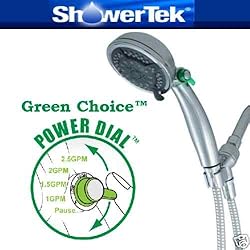 At ShowerTek, they are committed to real choice - YOUR choice. You choose your water flow - you choose your impact on water consumption and your cost. It's that simple.By law all showerheads flow water at a maximum of 2.5GPM (Gallons Per Minute), and if that's the kind of pressure you want then your Green Choice won't stand in your way. If you're moving slowly in the morning, just turn the dial and let water shoot out like it's a fire hose. There are even 5 different spray selections if you need variety: choose between Fully Body, Full Combo, Massage, Massage Combo or Mist. This isn't your typical low-flow showerhead; you can actually enjoy when you want to.While you're soaping up you don't need the showerhead blasting out of your hand, though, and if you're washing your face you certainly don't want a jet of water drilling on your eyelids. That's the beauty of the Green Choice. You can turn the flow down as much as you want with just one thumb. You can even do it with your eyes closed.The lower the flow, the lower your water bill. In 2009, the U.S. Department of Energy calculated that a family of 4 spends over $400 each year on showers alone, and that figure is based on a relatively modest 10-minute shower. With water flow set to 1GPM instead of 2.5GPM, you can literally cut that in half. $250 in savings is certainly nothing to sneeze at. The Green Choice will pay for itself many times over.Other low-flow showerheads offer water savings, but in reality they impose those savings upon you. With the Green Choice, you get to choose.